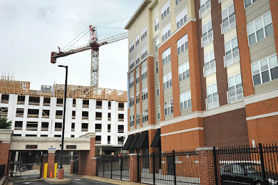 Construction is continuing on three large new projects along Columbia Pike. Depicted here are selections of what is arising at Centro Arlington (at the corner of the Pike and South George Mason Drive), Trafalgar Flats (at the corner of South Buchanan Street and the Pike), and Gilliam Place (at 3507 Columbia Pike, on the site of what had been the Arlington Presbyterian Church).